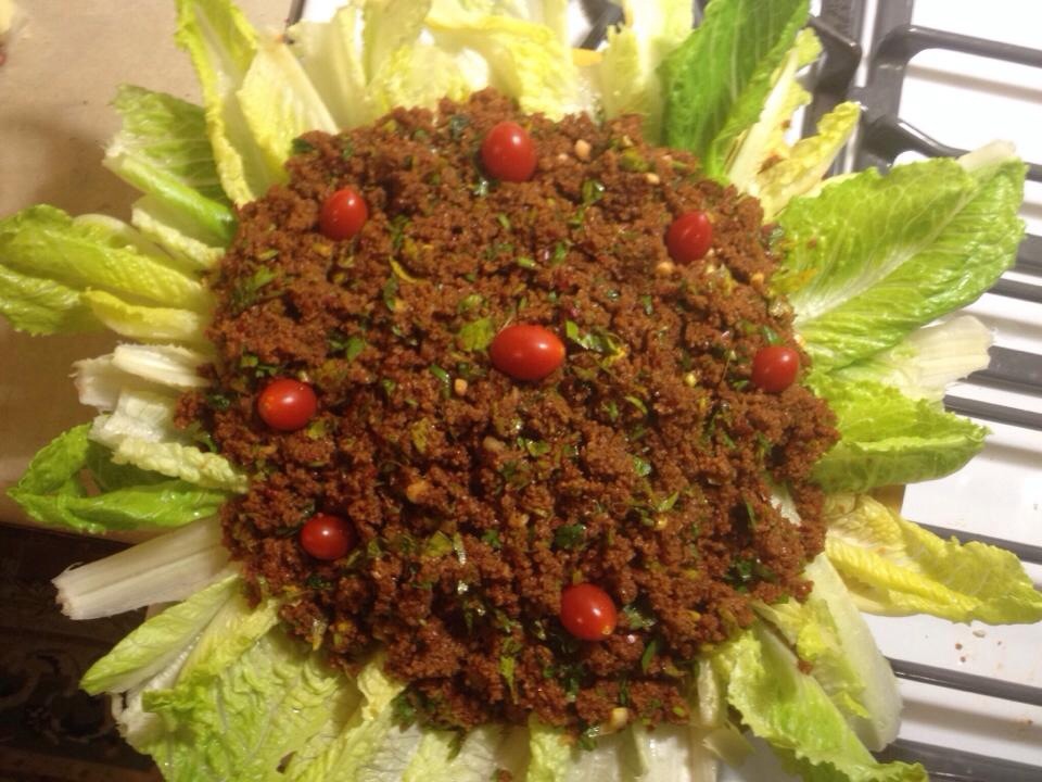 Tebbuli salad : serve with romaine lettuce ,whole wheat (bulgur),sun dried sweet red pepper paste,olive oil,choped tomatoes,green onions,italian parsley pomegranate molasses